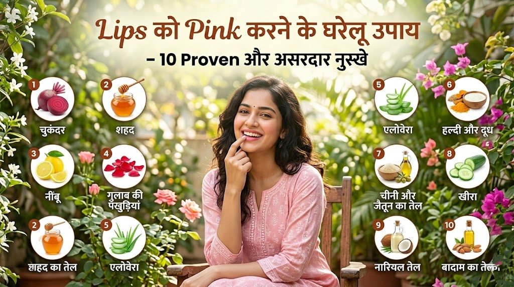 Lips को pink करने के घरेलू उपाय अपनाकर आप बिना किसी chemical या lipstick के naturally pink और मुलायम lips पा सकते हैं। आजकल काली और रूखी lips की समस्या बहुत common हो गई है। इसलिए, lips को pink करने के घरेलू उपाय आजमाना सबसे safe और सस्ता तरीका है। क्योंकि ये सभी नुस्खे 100% प्राकृतिक हैं, नतीजतन इनका कोई side effect नहीं होता। इसके अलावा, lips को pink करने के घरेलू उपाय में इस्तेमाल होने वाली सभी चीजें आपके घर में आसानी से मिल जाती हैं।